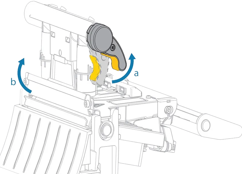 Allereerst open je de printknop door het gele mechanisme naar boven te klikken (a). Hierdoor komt de printkop naar boven en kan je de label en de ribbon doorvoeren (b).